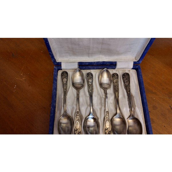 Orijinal kutusunda Madrid'den antikacıdan alınmış damgalı gümüş tatlı kaşık takımı.